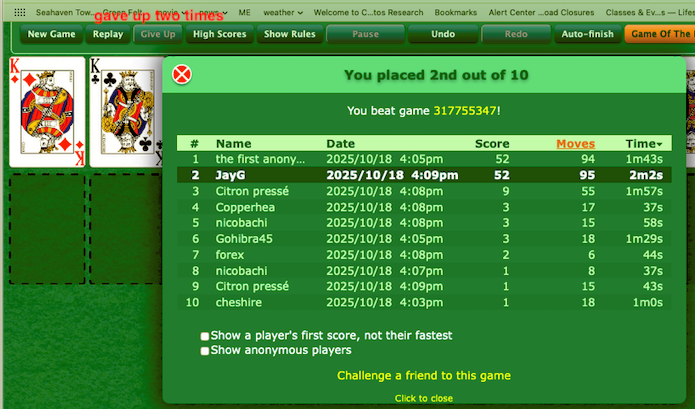 I played this game and hit the give up button and my name did not appear so I I clicked on replay and still could not win the games I hit the replay and on the third time giving up my name appeared. this has happened on a few other games. Not a problem but though I would mention it.