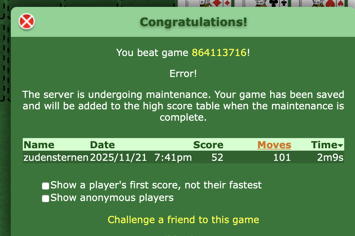 Got a new record going: currently 19 games unsaved. We'll see if they save once the database comes back online.
