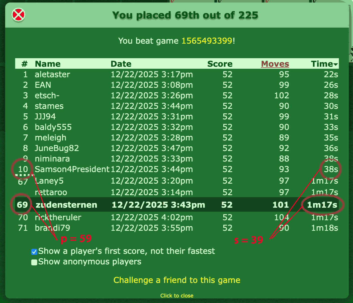If the #10 player finishes faster than 1:10, then my s will be less than p.